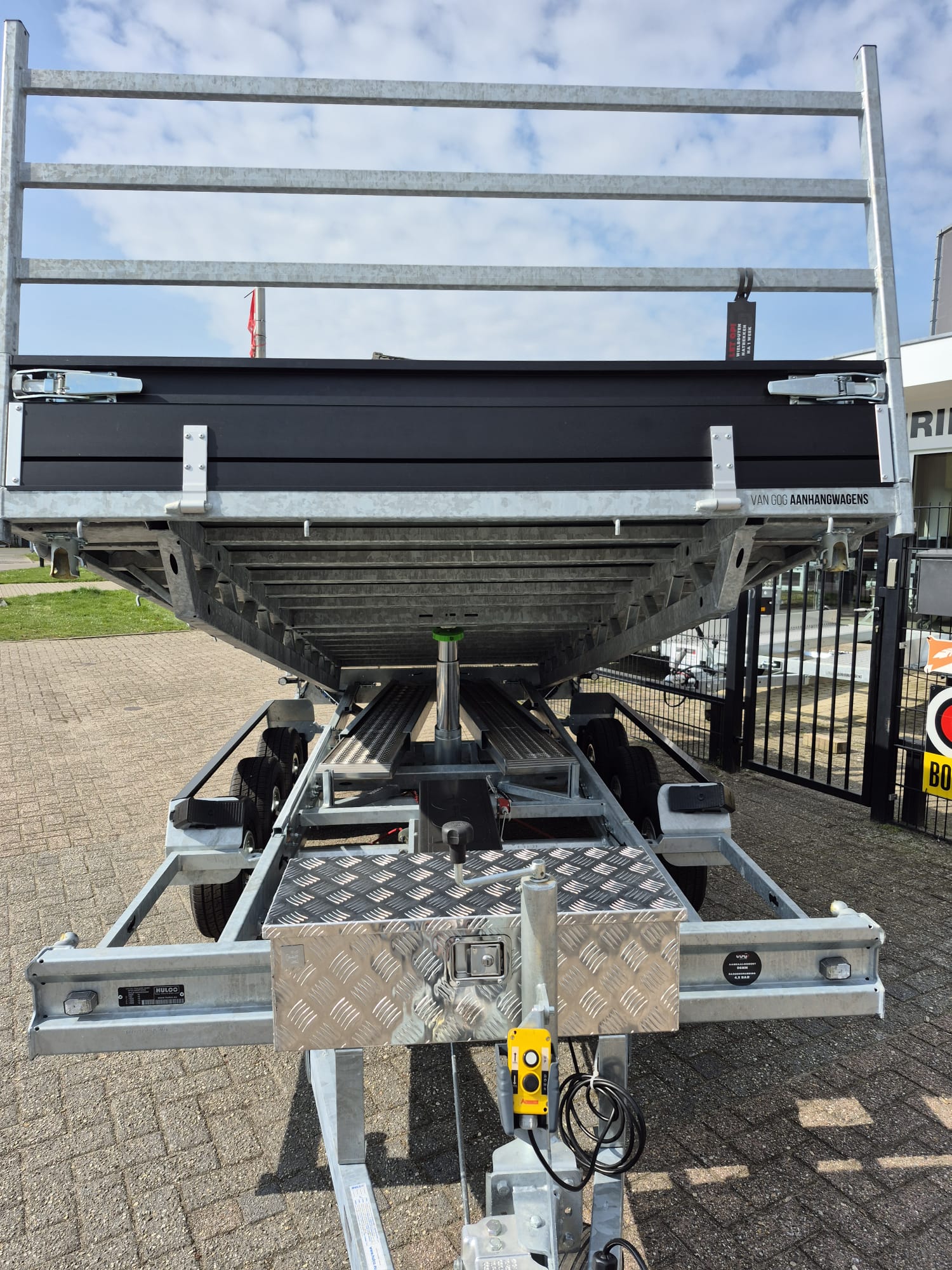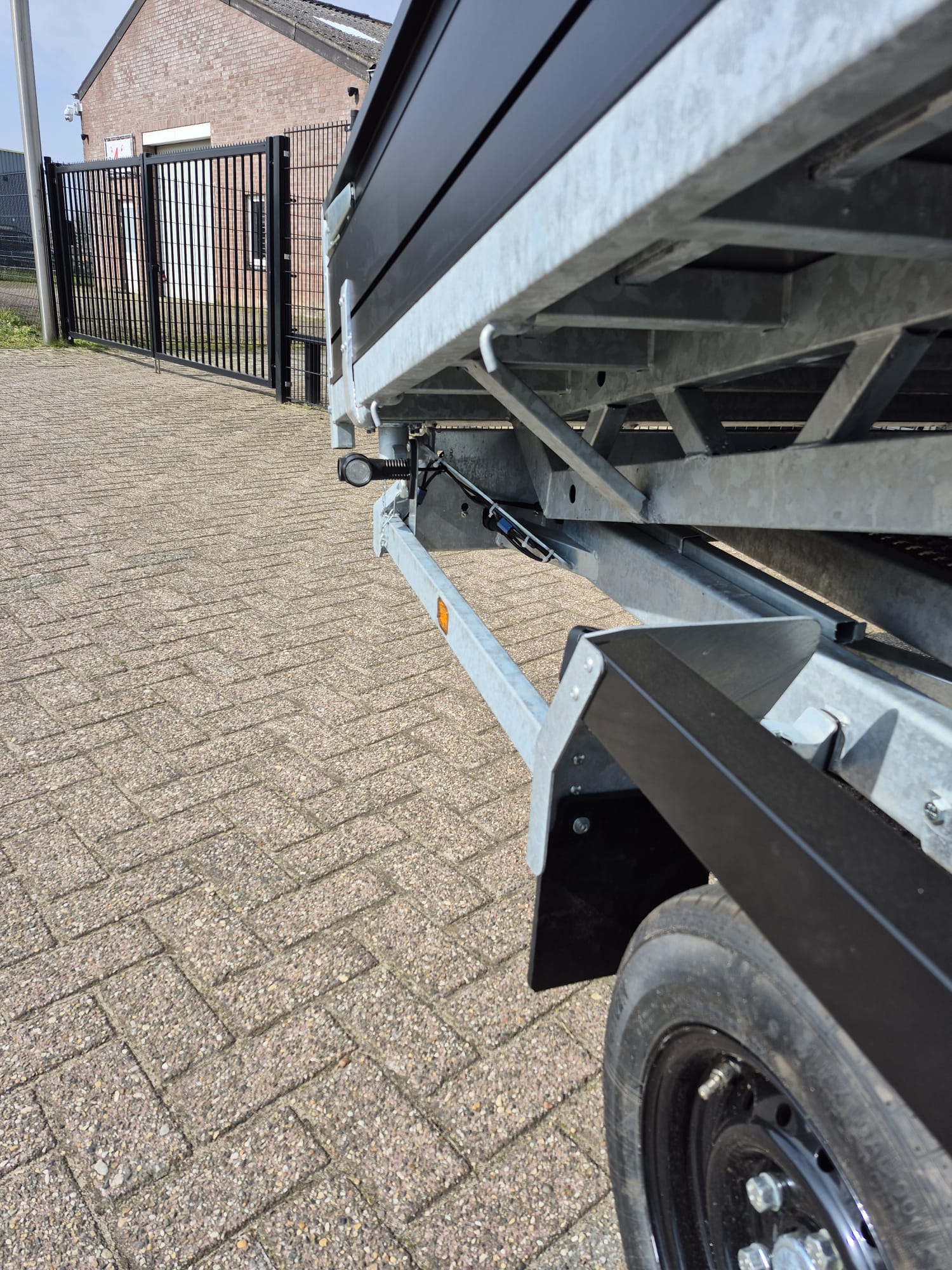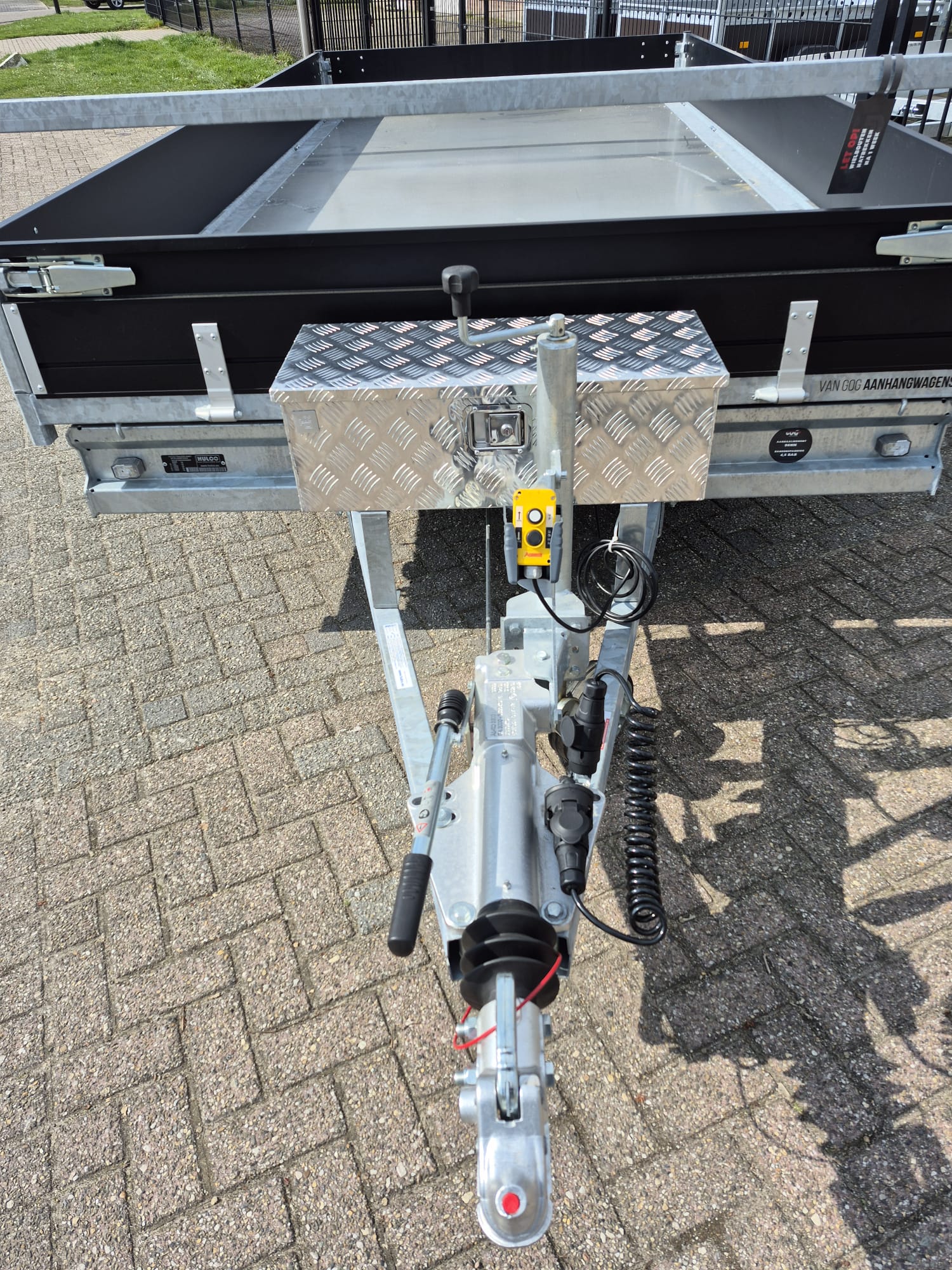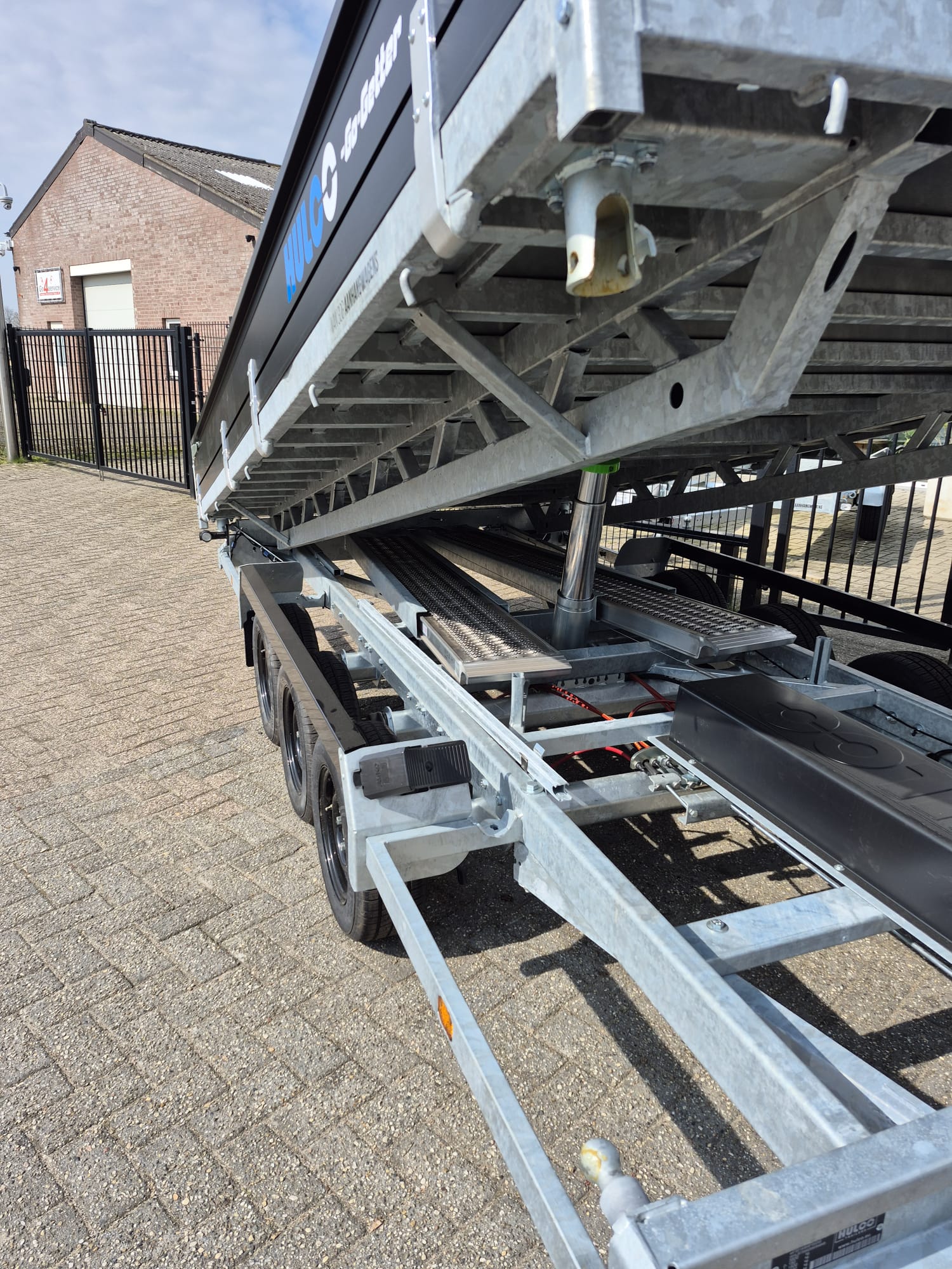 De driezijdige kiepfunctie tot 49° wordt bediend met een krachtig hydraulische 5-traps cilinder. Het systeem heeft een eigen accu met oplader, accu indicator en afstandsbediening.
